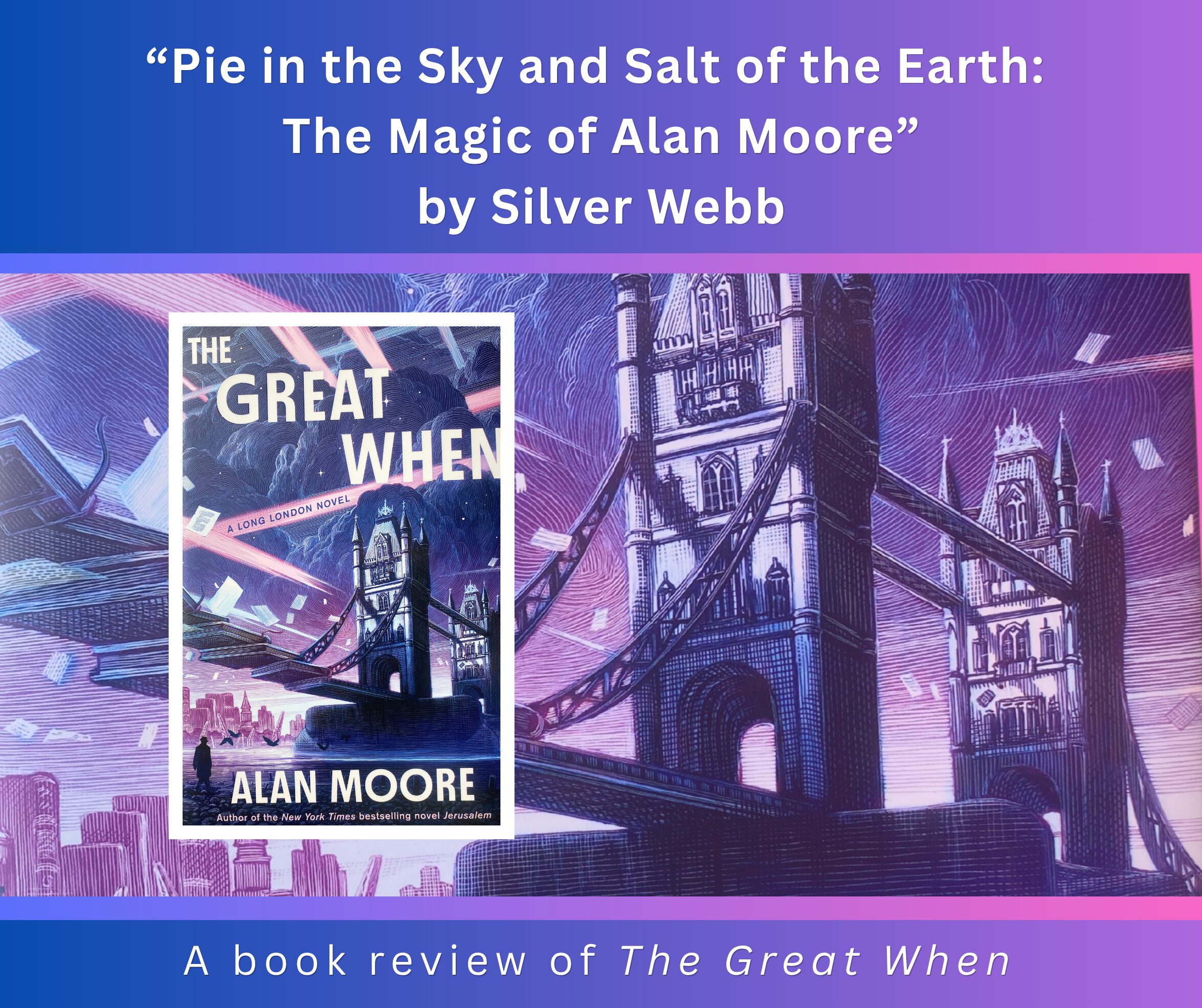I will also say that some of what he’s playing with comes close to China Miéville’s The Last Days of New Paris, which is set in WW2 with surreal art come to life. Miéville also wrote a book called The Lun Dun several years ago that, while middle-grade fiction, is about a magical alternate version of London. I’m not saying Alan mainlined Miéville and spit out The Great When. But he certainly must be aware of those books, as well as Ben Aaronovitch’s The Rivers of London Series, V.E. Schwab’s A Darker Shade of Magic, and Neil Gaiman’s Neverwhere, all of which take a parallel or hidden magical London to be their premise. Alan is playing with an idea already well established in our literary imaginations rather than innovating a new one.