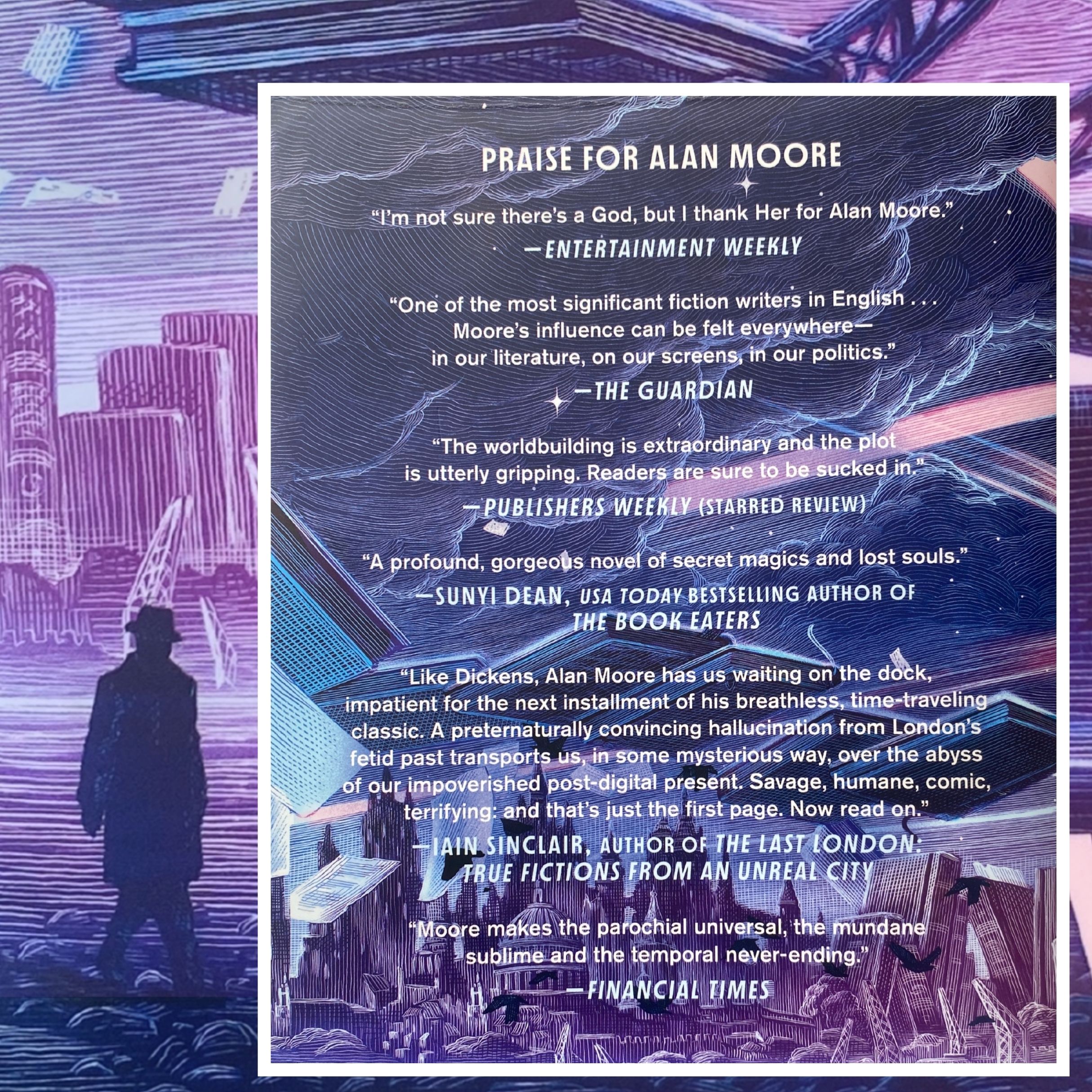 And then? At page 200, Alan wraps up all the major plot points that have been presented so far. Done. The book should end, we think. Instead, he tacks on 100 more pages of a plot that while hinted at in the first two-thirds of the book, is in no way something that the reader expects or needs as anything other than character development for Dennis that may (or may not) pay off in Book 2. And Alan ends with a baffling epilogue with an unspecified character contemplating mortality and modern London. Whether these are just Alan’s thoughts on death and London, or a character in the book’s line of thinking, we do not know. It only seems to connect to the start of the book in that it mentions a cat. It had me wondering if nobody at Bloomsbury Press had the brass to put the editing pen to Moore’s unapologetic anarchism run off the rails. So. There’s that. You have to love language to sit through some of the obscure bits. And I did. And I loved it.